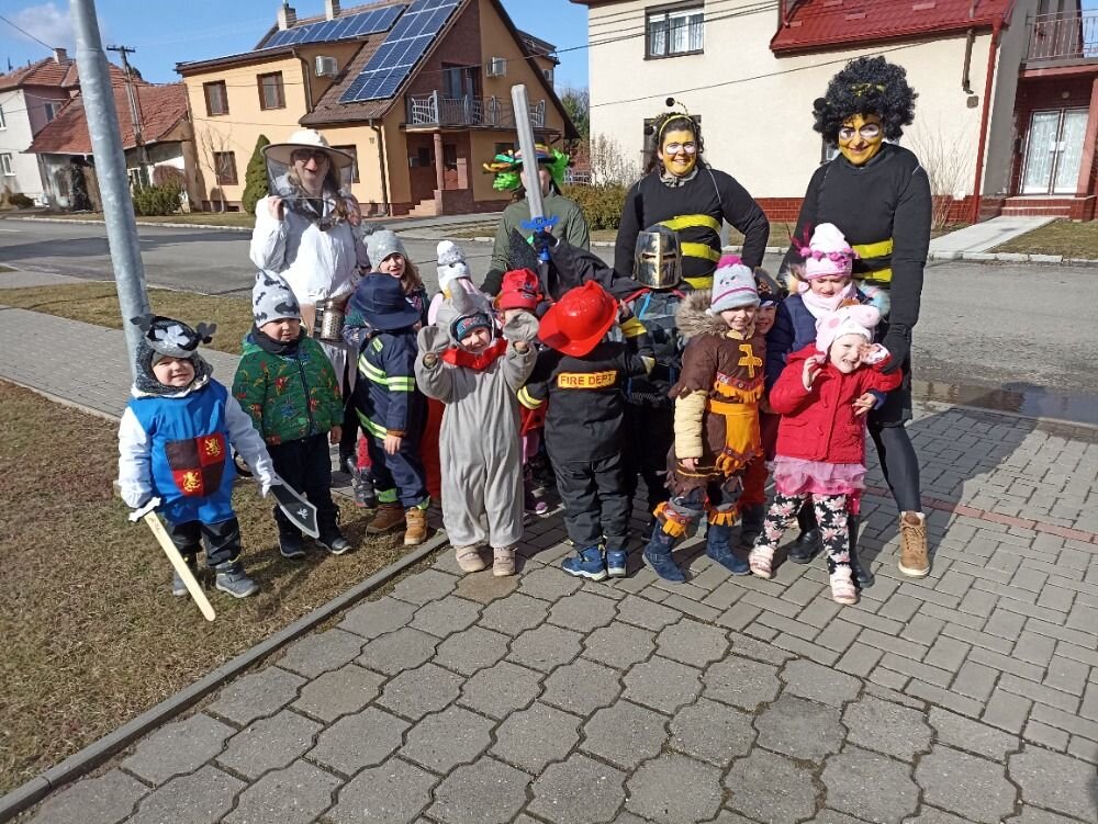 Abychom jsme se poveselili i rodiči, babičkami a dědečky, tetičkami a strýčky vydali jsme se s dětmi na obchůzku po vesnici, přičemž nám vyhrávala muzika z rozhlasu. Při zastaveních jsme s dětmi zpívali písničku „Pod šable, pod šable, aj pod obušky, my všecko bereme, aj plané hrušky.“ Během obchůzky jsme vybrali 1 700,-Kč, za což Vám všem ze srdce děkujeme. Mateřská škola se připojila ke sbírce Pomoc dětem na Ukrajině a za vybrané peníze při masopustním průvodu budou zakoupeny požadované věci pro děti na Ukrajině.